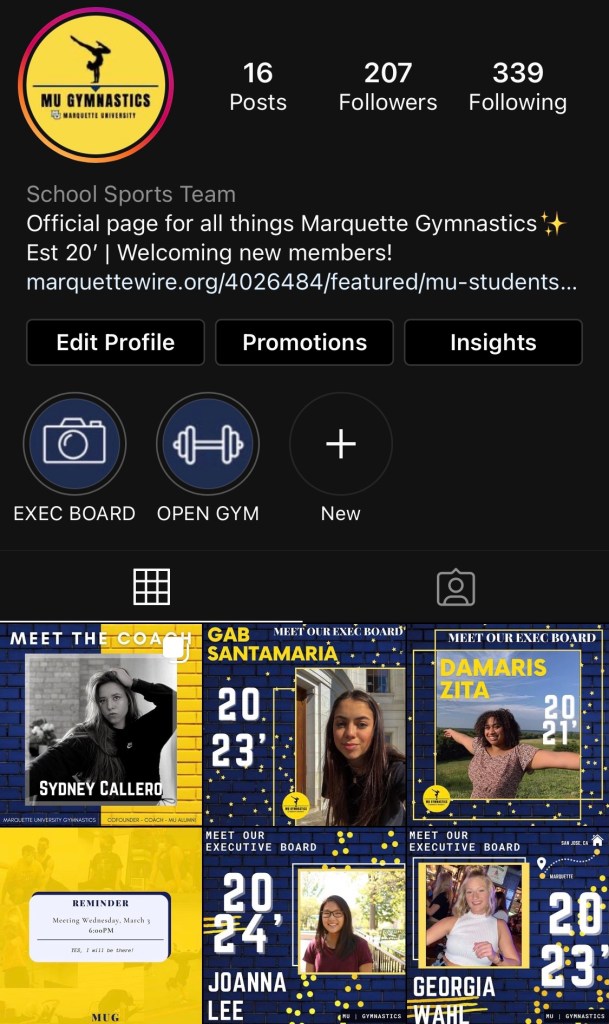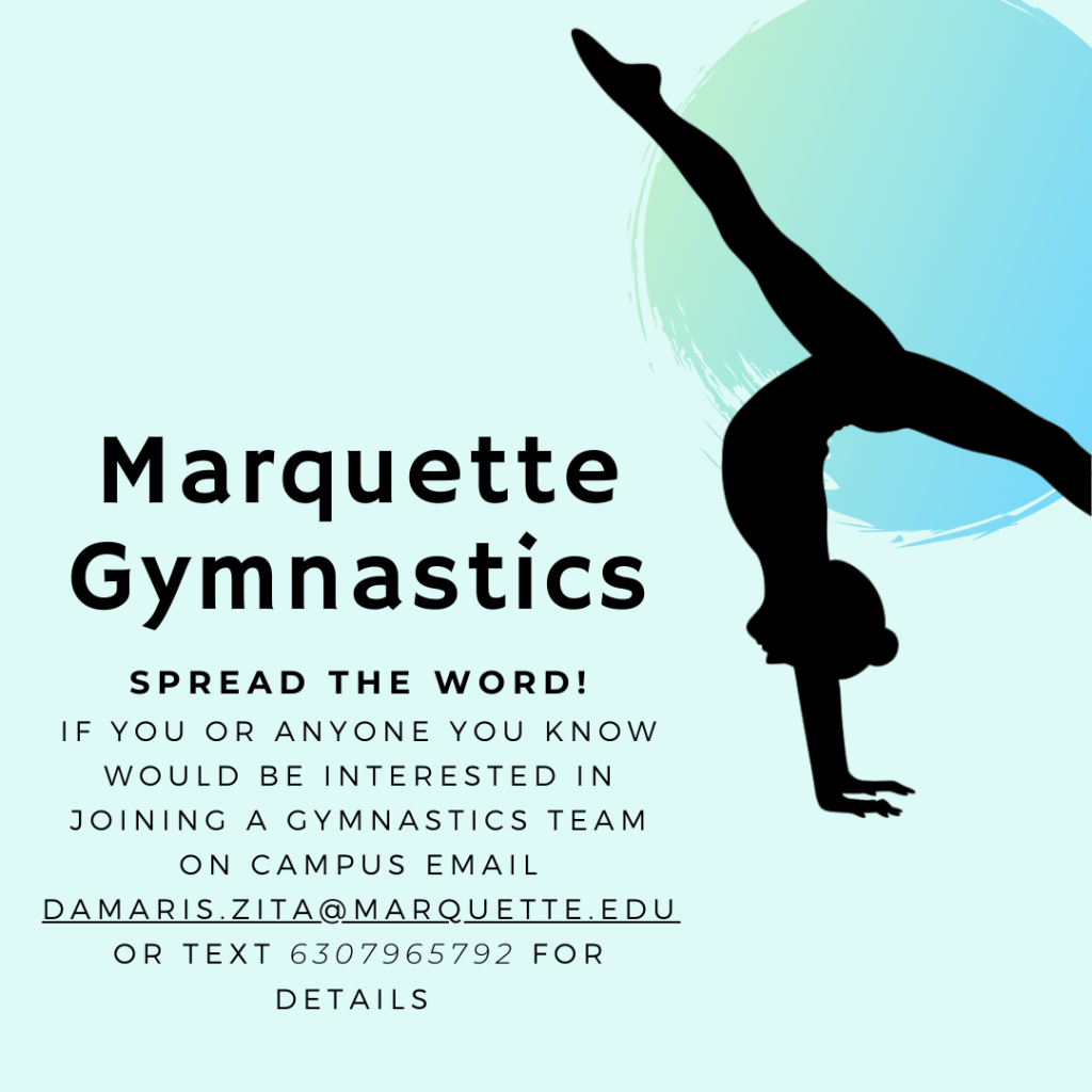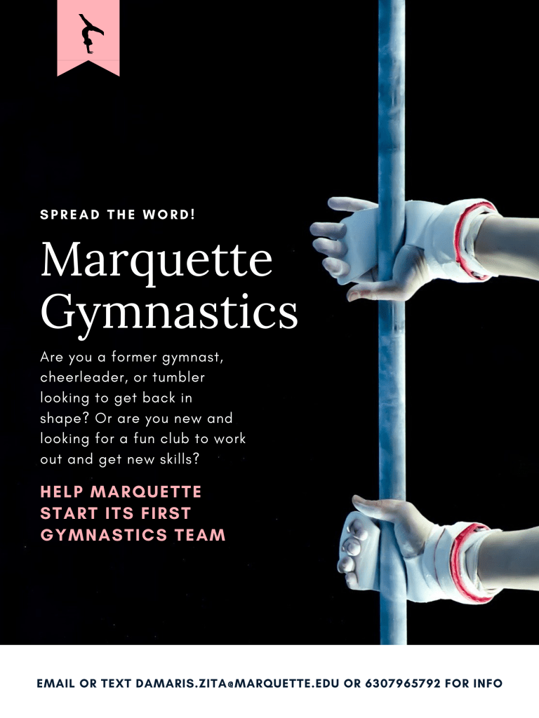 I found myself hesitantly pondering an impossible question, “Do I accept a ride from a complete stranger (a female’s mind always goes straight to serial killer) or do I brave the 2 hour bus ride alone, at night, in a city with one of the highest crime rates in the US?”. Ultimately I chose the stranger and I was incredibly lucky that they showed the compassion and generosity that they did that day. You may be wondering why and how on Earth I found myself alone at night at a gymnasium and the answer would be rooted in my love for gymnastics. I am fiercely independent, albeit sometimes to a fault, and I was determined to find a way to continue doing what I love. Fourteen years. That’s how long I was a gymnast for. I wasn’t ready to give it up when I went to college at Marquette University and found that they didn’t have a gymnastics team. After my harrowing experience I decided that I should not need to put myself in harm’s way to practice gymnastics, I would start a club at Marquette. I researched and asked around and finally got in contact with the director of recreational sports, who informed me that I would need to come up with a list of 20 students who were interested, a 3 year budget, a facility to practice in, a mode of transportation, and a proposal to present to the board. I took on this monumental task with no previous knowledge and was able to put it together in less than 2 months. I created advertisements and pushed it out on my social media, leveraged my connections to the Marquette Student Government social media and several school fraternities and sororities to release the flyer, and handed out the flyer to the gymnasiums on campus and had them put them up on bulletin boards. Before I knew it my phone and email were flooded with students eager to learn about the club and join. I partnered with another student, who reached out to me after hearing about the club, and together we contacted gyms around the area and got price quotes, developed a budget, fundraised, and advertised the club. We were able to advertise through shoutouts at school talks and functions, social media, print media, word of mouth, and were even featured in the school newspaper and a segment in the school TV channel.